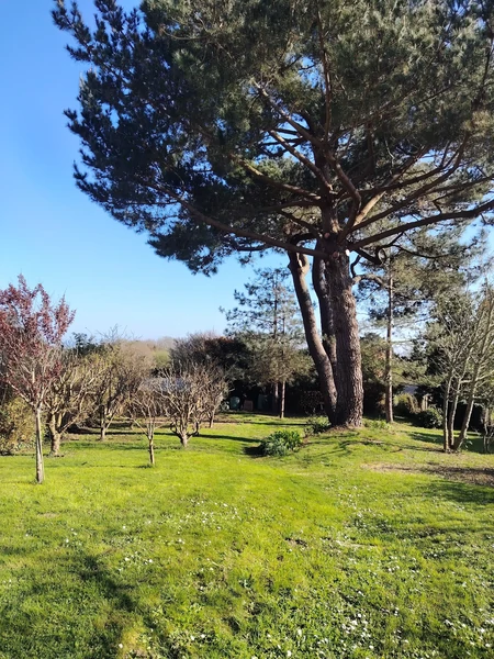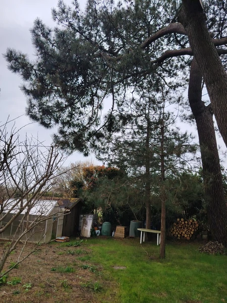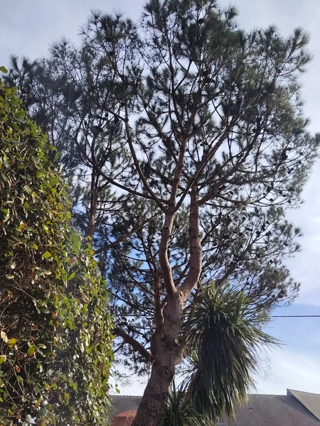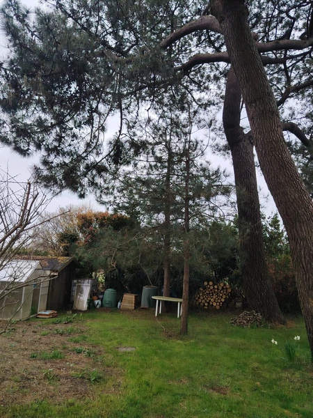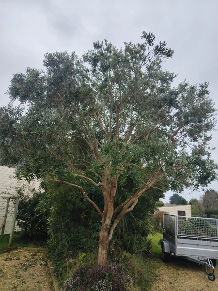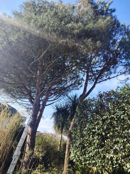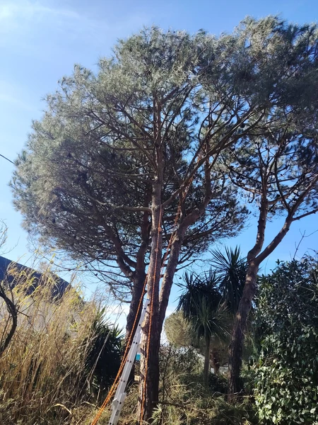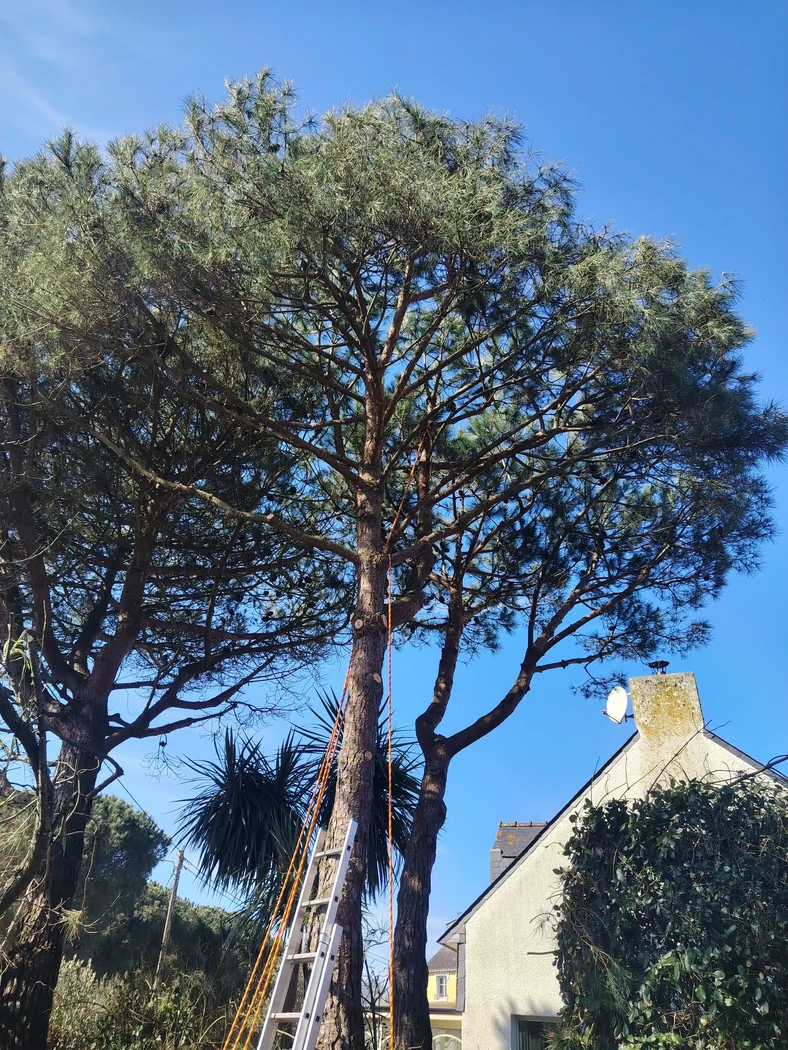 (Après) pin avec branches enlevées avec rétention (système de corde sur poulie) pour éviter toutes chutes sur la serre